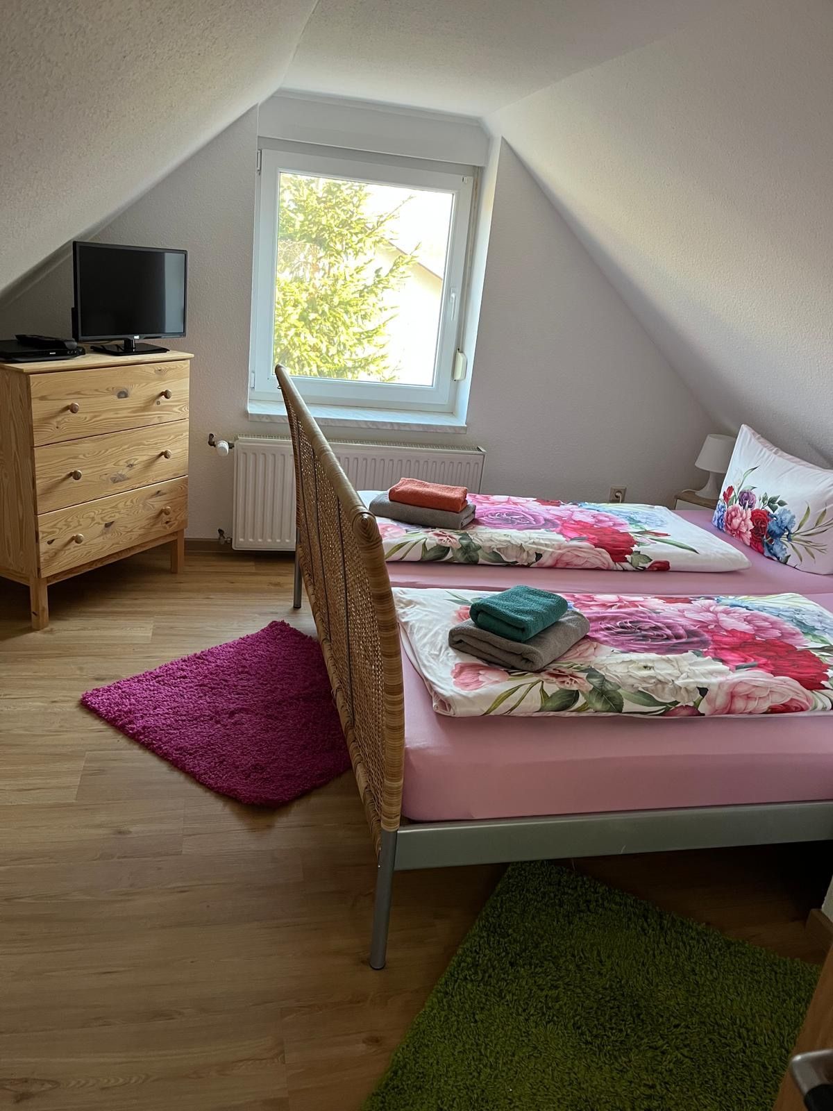 Das kleine und gemütliche Bad hat eine ebenerdige Dusche, Waschbecken und WC.